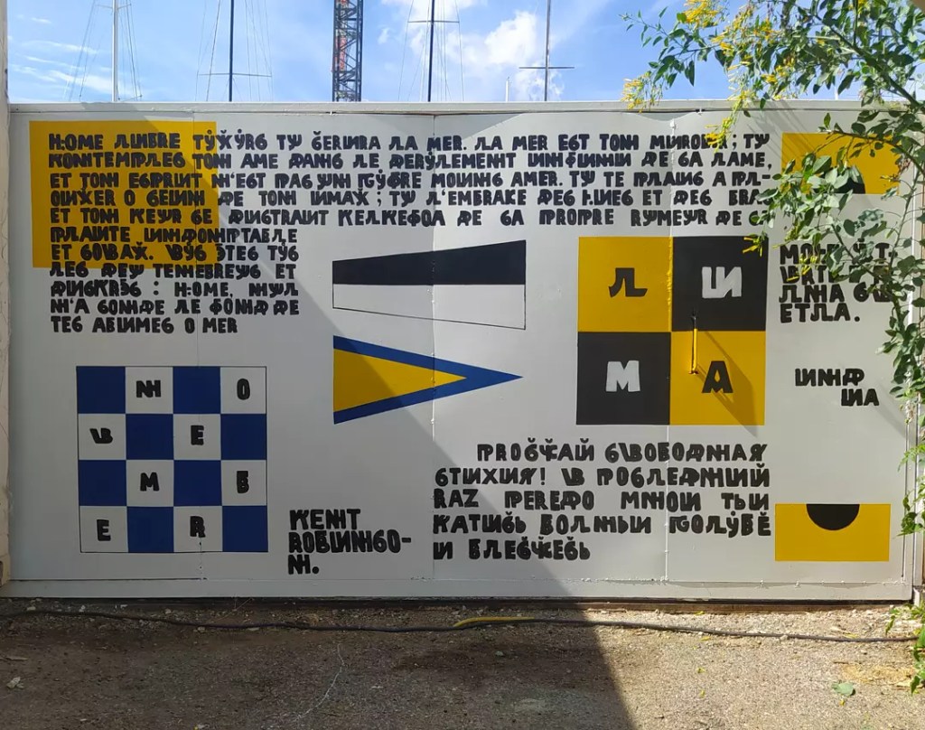 Réalisation d’un fresque mêlant Cyrrilatin et pavillons de communications maritimes lors de ma résidence en septembre à Thalassanté au port de l’Estaque. Les extraits de textes représentés de Baudelaire et Poushkine racontent la vision de l’Homme qui fait face au puissant élément qu’est la mer. Les drapeaux représentés en à-plat colorés, questionnent quant à eux les techniques de communication entre bateaux.