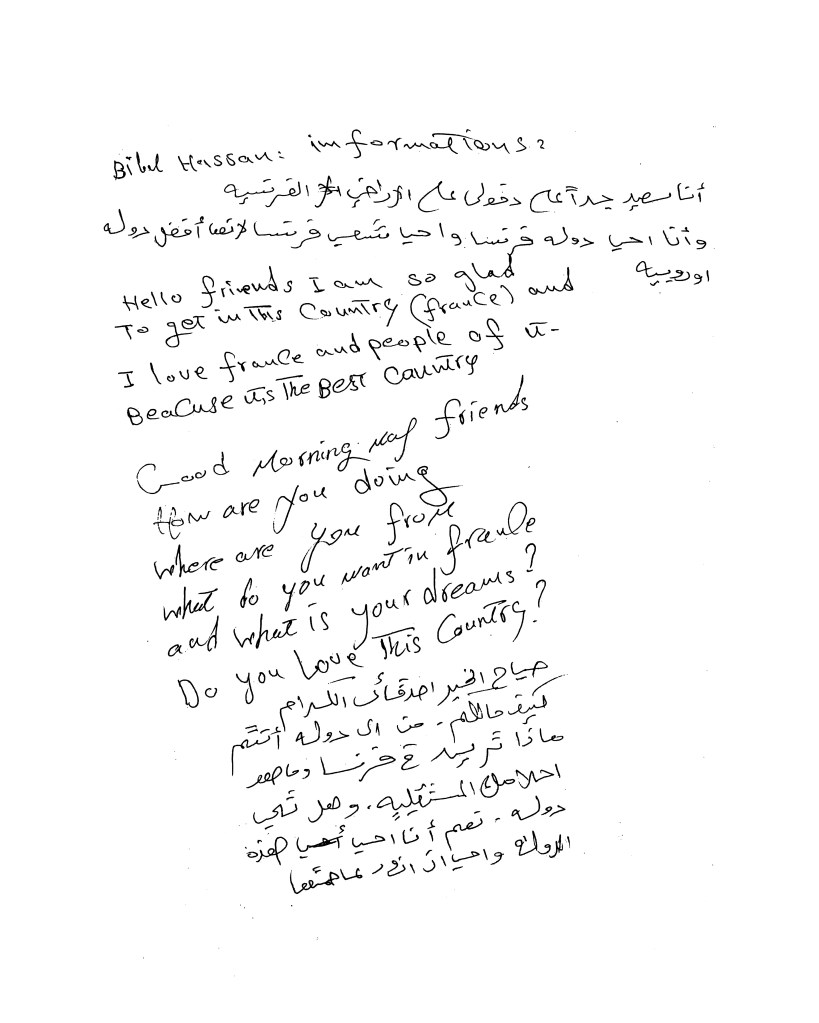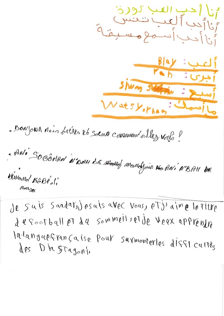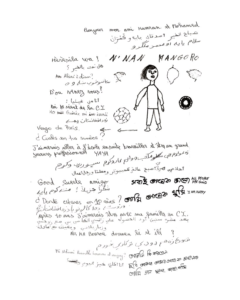 Plus tard nous avons travaillé sur la forme de l’écriture en composant des textes aux langues plurielles. Présentés en fin d’atelier comme des dessins, ces longs cadavres exquis linguistiques ont permis à des langues qui s’ignorent de cohabiter sur la même page. L’espagnol, l’arabe le pachto et l’italien dansaient alors main dans la main sur l’A4 perforé.