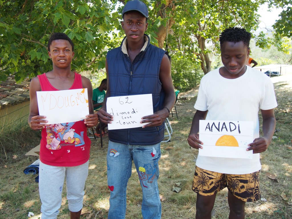 Au cours d’un exercice et pour apprendre à se connaître, Les jeunes transforment leur prénom en mots du quotidien. Peu importe la langue, l’idée c’est de transmettre une émotion, un sentiment, qu’il soit en bambara, en peulh, en wolof, ou en français.
