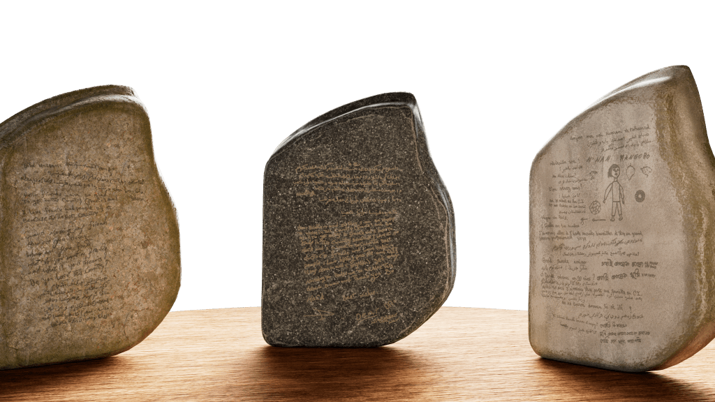 La Pierre de Rosette est un puissant symbole de traduction et de rencontre entre les peuples. Les sculptures laissées à la maison Notre-Dame témoigneraient de ces moments passés ensemble, tout en mettant à l’honneur l’échange des langues et la découverte de mots comme des trésors migratoires.