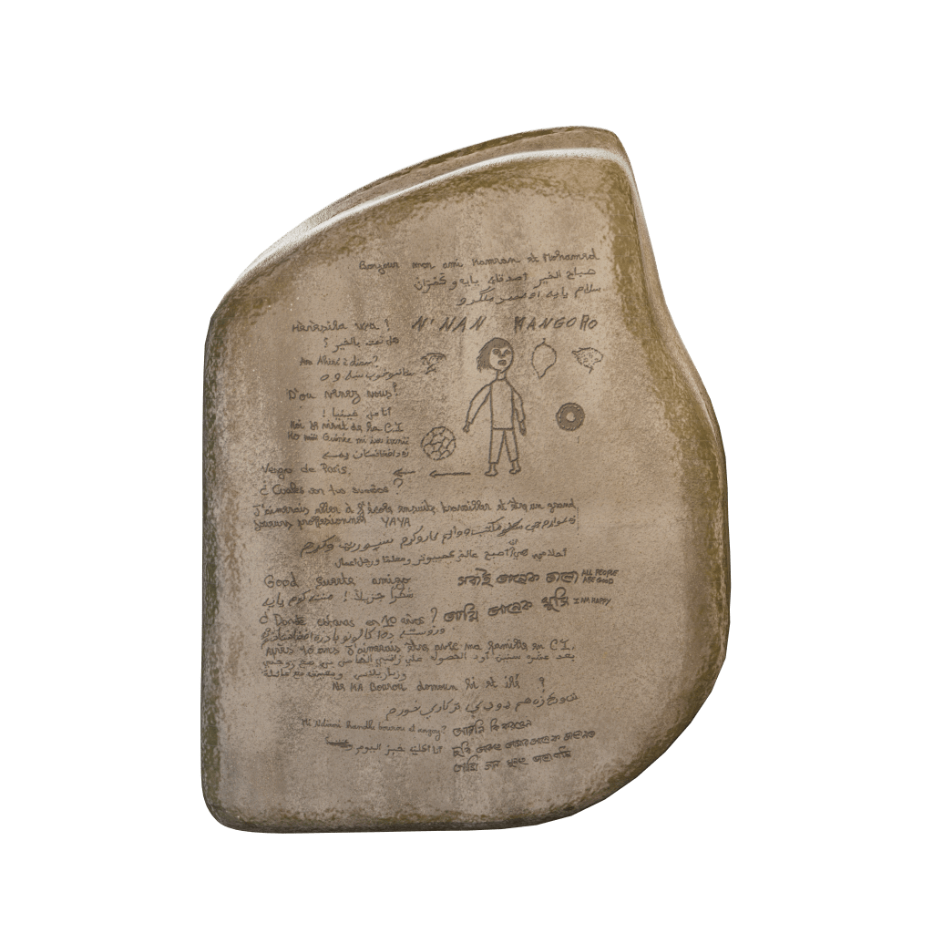 La suite, c’est la création d’une série d’œuvres inspirées de la célèbre Pierre de Rosette avec une finalité de projet sculptural : une série de stèles en ciment comportant les textes-dessins des jeunes gravés au laser. La série serait présentée lors d’une exposition dans le centre d’accueil, agrémentée d’une série d’enregistrements effectués lors des ateliers en amont. Une partie en accord avec le centre y seraient exposés de manière permanente.