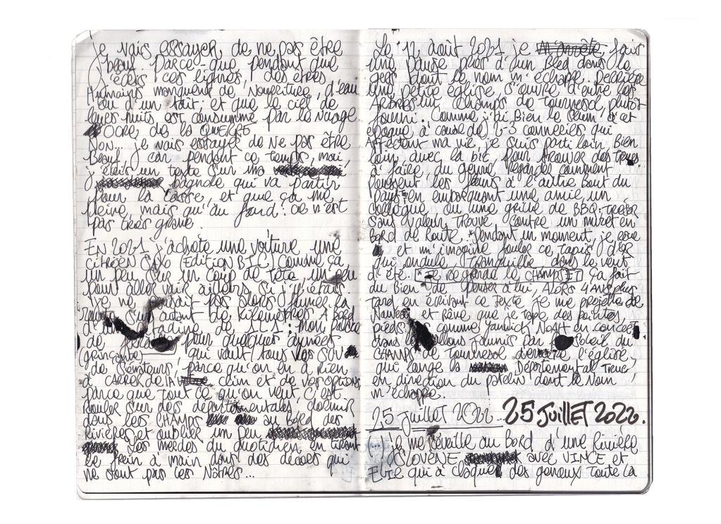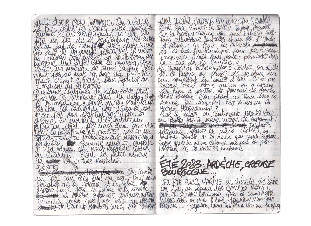 Je me réveille au bord d’une rivière slovène, un beau matin d’été, aux côtés de Vince, dans la tente et d’Élie qui a claqué des genoux toute la nuit dans son hamac. On a garé la BIC dans la forêt juste derrière, comme si on avait voulu qu’elle profite un peu de la fraîcheur des arbres et du feu de camp avec nous. Vince se fout de ma gueule parce que je mets le cligno par réflexe en la sortant des buissons. Des araignées et insectes en tout genre ont déjà élu domicile dans l’habitacle.