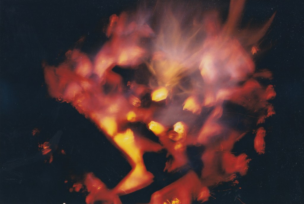 Début de soirée : la rivière est fraîche, pas comme nous après le morceau de buvard qu’on vient de se mettre dans la gueule. Pendant un moment, le soir s’étire. Nos discussions interminables et nos rires se perdent dans les flammes du feu de camp et le ciel nocturne.